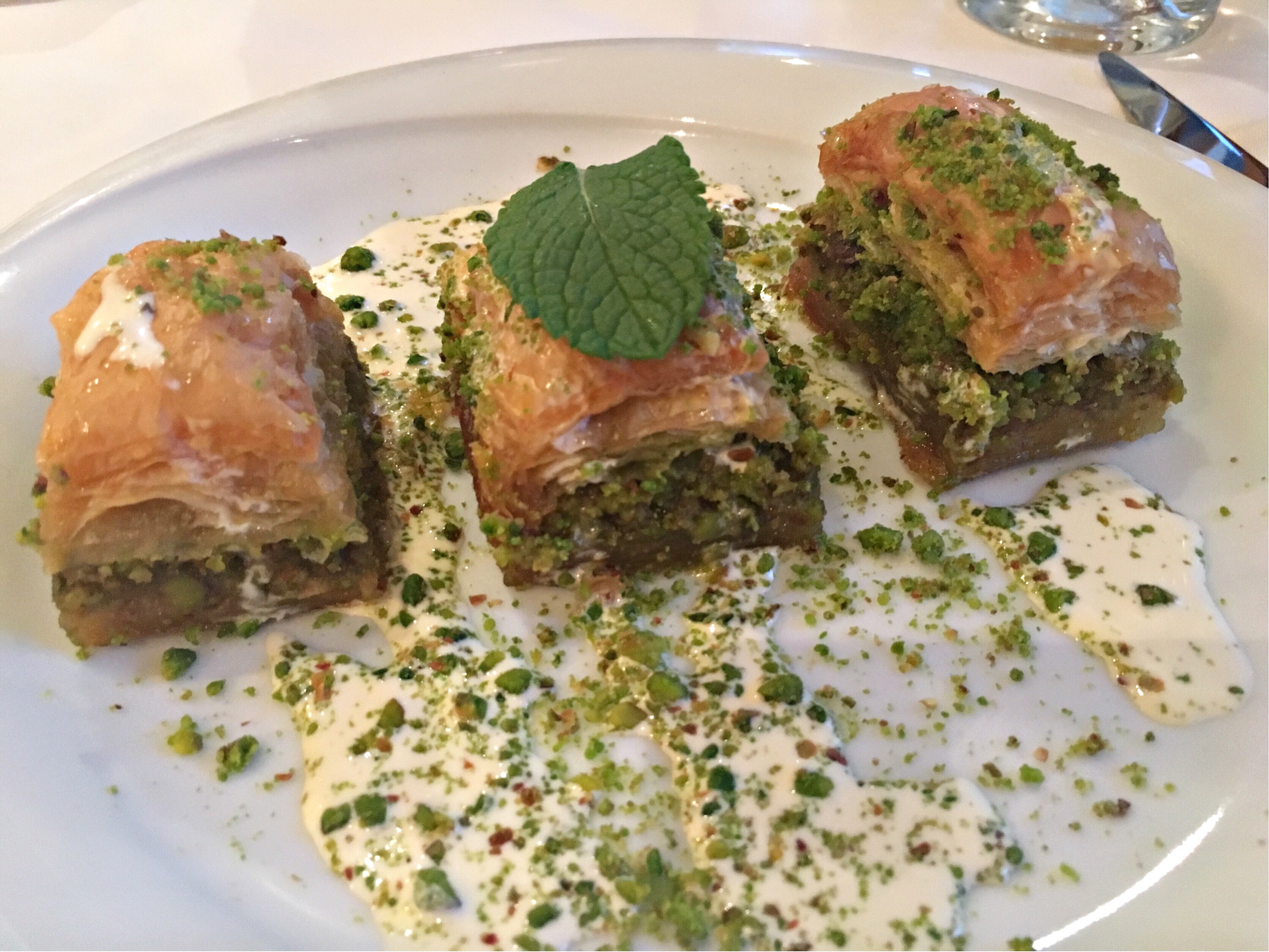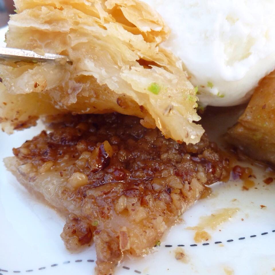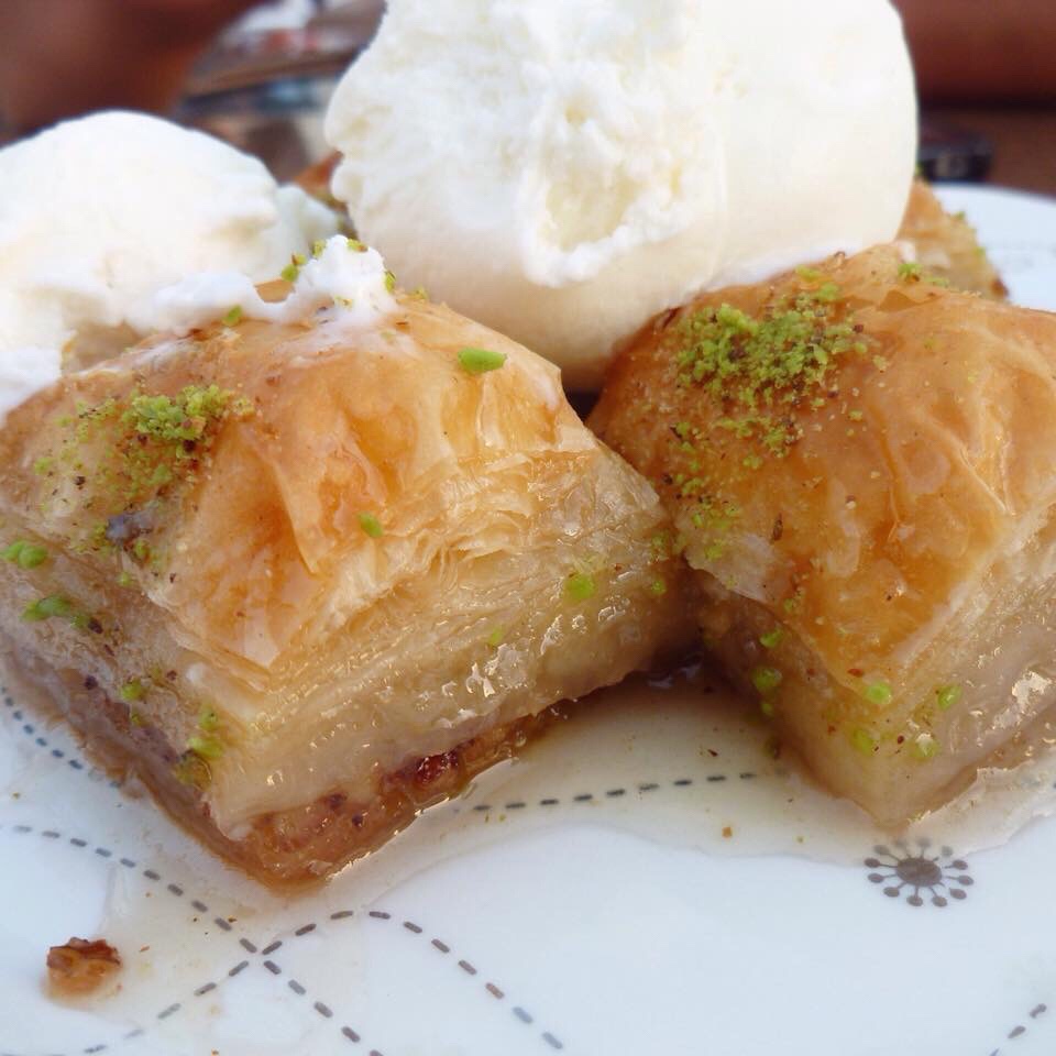 Baklava is a sweet dessert, made from layers of filo pastry and melted butter, and layers of nuts (pistachio or walnut). It’s cut into rectangle, diamond or triangle shapes then baked. Once baked, a syrup is poured over, making it sticky and sweet. The thin, crispy filo pastry is softened by the syrup as it penetrates through every layer. It’s often served with ice cream or cream and sometimes has more pistachio nuts finely ground on top.