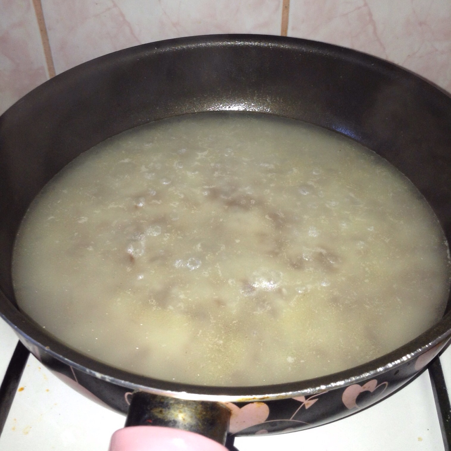 Now add the hot water, half the chicken stock cube and a little salt. Stir a few times, turn up the heat and bring to a boil.